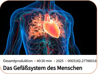Das Gefäßsystem des Menschen besteht aus der Gesamtheit aller Blutgefäße sowie dem lymphatischen System und hat zur Aufgabe, Blut bzw. Lymphflüssigkeit in den jeweiligen Gefäßen zu transportieren und damit alle Organe im Körper zu versorgen. In der Produktion wird die Bandbreite aller Gefäße von den Kapillaren bis zur Aorta dargestellt, und auch damit verbundene Erkrankungen werden angesprochen.